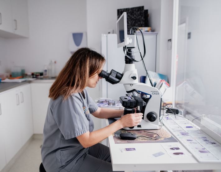 Cytology is a diagnostic test used by the veterinarians at Onevet Ani Mar Fão Veterinary Clinic to detect abnormalities or lesions in cells. To do this, we need to take a sample of the lesion by needle aspiration or by imprinting the lesion, apply staining techniques to the sample and analyse it under a microscope.